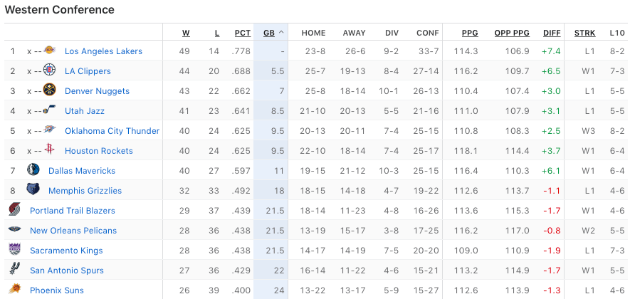 In this image, we have the teams in the west that were invited to participate in the end of the regular season in Orlando, with 8 teams being able to advance to the playoffs. 8 games isn’t exactly a whole lot to really change the 8 or 9 seed, but it for sure can change how the playoffs will shake out.